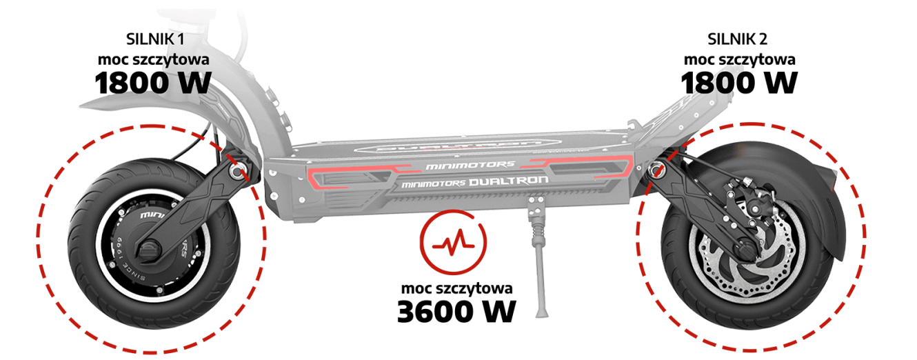 Omawiając maksymalne osiągnięcia tego modelu, nie można zapomnieć o jego silniku. Podwójna piasta BLDC o łącznej mocy 3600 W pozwoli Ci na bezproblemowe i szybkie poruszanie się tak po mieście, jak i poza nim.
