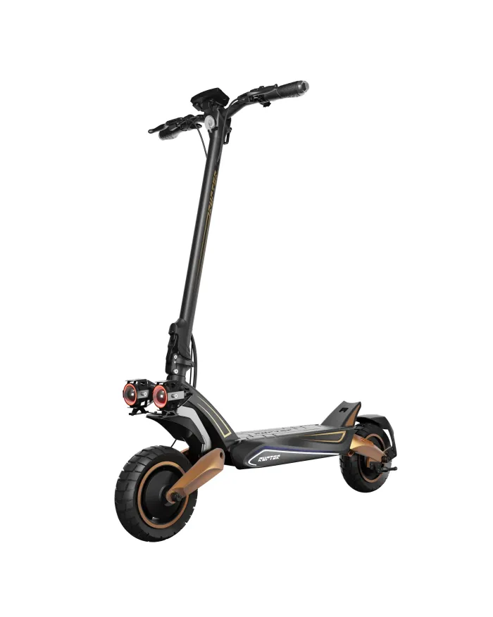 Ruptor R6 V4 wyróżnia się również spektakularnym systemem oświetlenia, który gwarantuje nie tylko styl, ale przede wszystkim bezpieczeństwo. LED RGB w podeście, podwójne przednie reflektory z czerwonymi ringami, tylny LED z logo Ruptor, a także kierunkowskazy wbudowane w kierownicę oraz ambientowe światło wokół hulajnogi tworzą unikalną i niezapomnianą sygnaturę świetlną. To kompleksowe oświetlenie zapewnia doskonałą widoczność i rozpoznawalność nawet z dużej odległości, co sprawia, że poruszanie się po zmroku jest znacznie bezpieczniejsze i bardziej stylowe.
